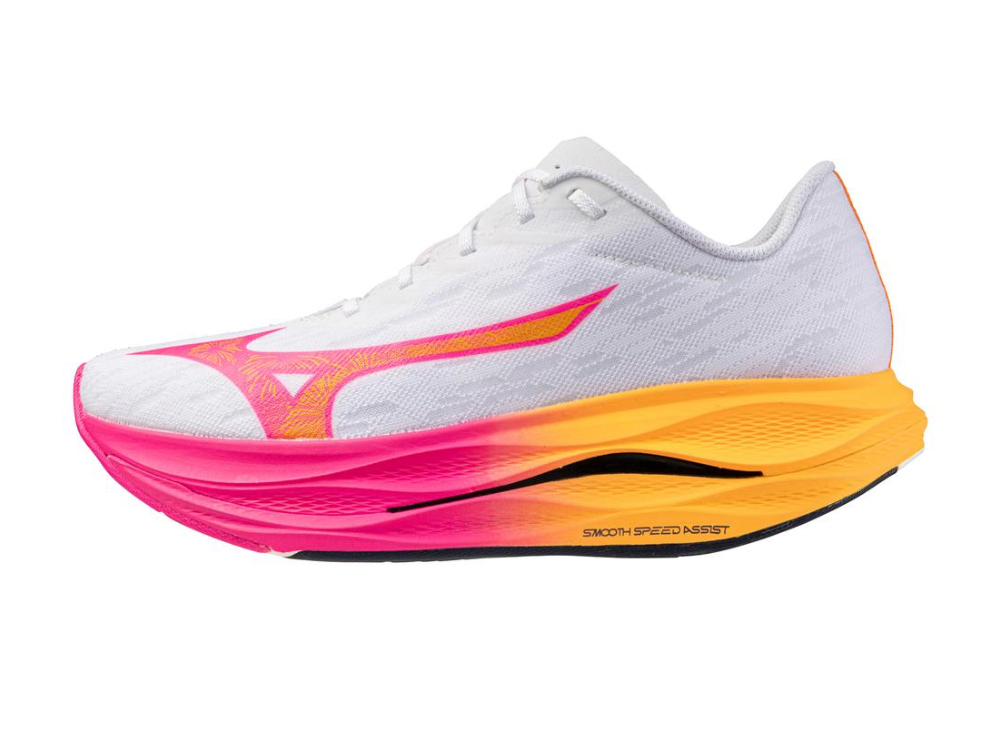 - Smooth Speed Assist: Mizuno's signature geometry that is designed for maximum performance. The significant heel bevel encourages an efficient midfoot landing, the midfoot contact point supports the calf and the aggressive forefoot rocker delivers a smooth and propulsive transition.